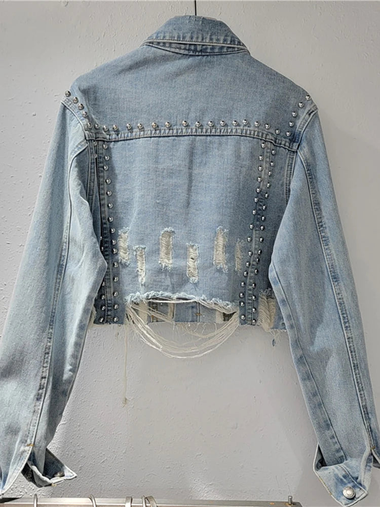 Women's Denim Coat Embroidered Flares Broken Holes Rivets Single Breasted Short Jackets Autumn New Fashion
